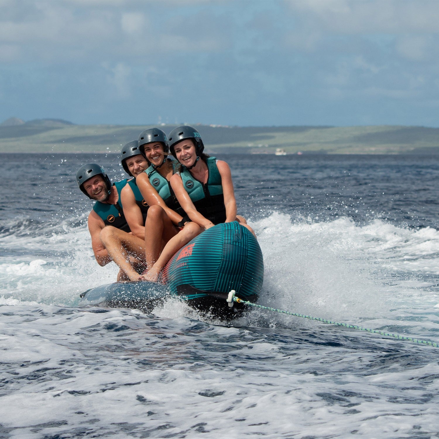 Be a fool and climb aboard Jobe's 4-person Chaser for the time of your life. This is a serious towable for riding with friends and family. The durable 840 nylon double-stitched outer shell protects the 28-gauge PVC base and tube from damage. Hold on tight to the comfortable and super-strong nylon-wrapped handles with deluxe knuckle guards. It features a one-way valve and quick-release cable connector for convenience.